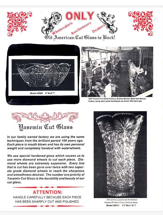 In reply to inquiry and comments of ACGA members, we feel obligated to present to the entire membership an overview of the Yasemin Cut Glass company. This is neither an affirmation nor condemnation of the company and its practices. It is rather an article of information for the membership’s contemplation.