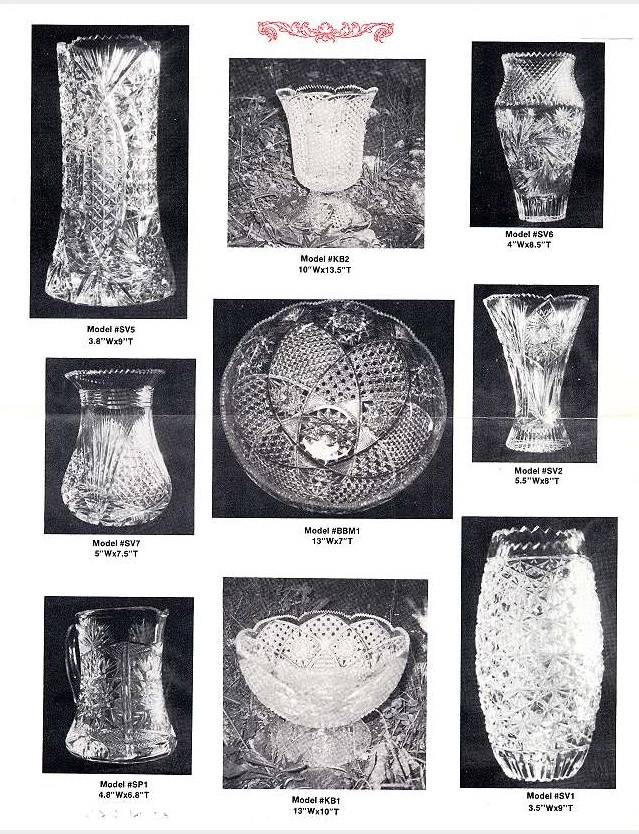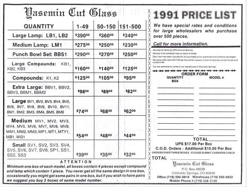 The files of Martha Louise Swan contained an 8-page 1991 catalog for Yasemin Cut Glass. The brochure states: “OLD American cut glass is back!” Yasemin was a family-owned company that advertised ‘factory direct from Russian Border.” They had a post office box and phone number in Colorado Springs, CO. We have not been able to find any reference to Yasemin Cut Glass in current searches on the internet.