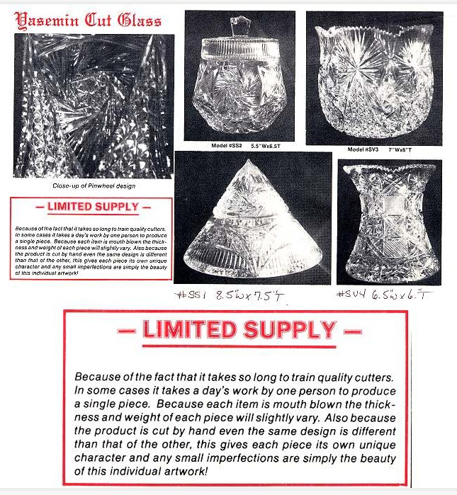 The ad recommended calling for their photo collection and pricing, which we did. The catalog is, by printing standards, quite good, being done on good gloss paper and containing complete information and 35 photos of Yasemin cut glass. The photo bordering is a bit heavy — but that’s just an artistic opinion.