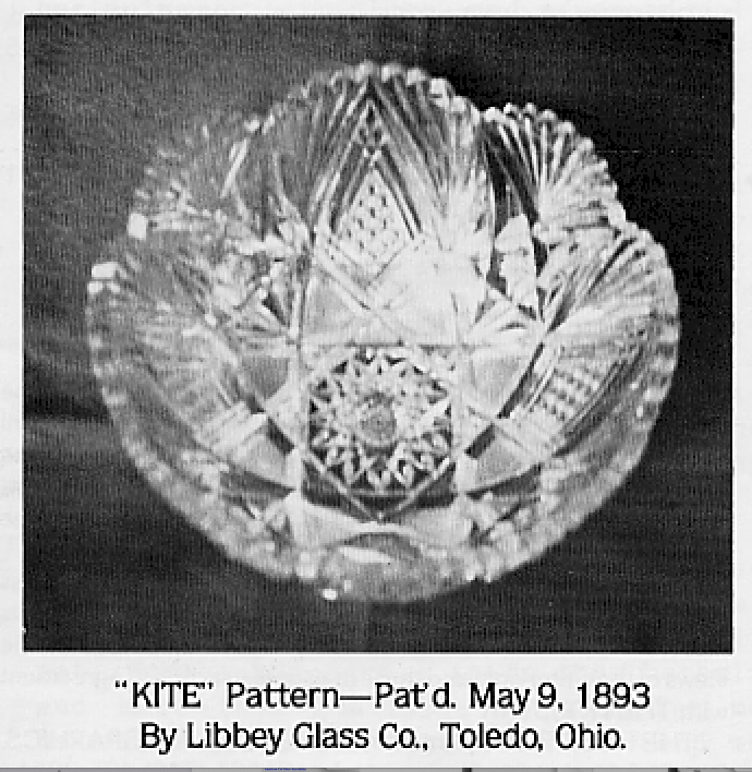 The "Kite" pattern, designed by William C. Anderson and patented by him on May 9, 1893 for the Libbey Glass Co., is the first of two "Kite" patterns designed by him. Both patterns were, however, named by Albert Christian Revi in his book, "American Cut and Engraved Glass," and not by Anderson. In his patent specifications however, Anderson referred to kite—shaped fields in both designs. So, in spite of different designs, Revi named them both "Kite". William C. Anderson started work for the New England Glass Co., and their well—known "Middlesex" pattern was designed by him. He continued working for the Libbey’s after they took over the New England Glass Co., moving to Toledo, Ohio, in 1888 when the Libbey Glass Co. was relocated there. In Toledo he was superintendent of the cutting department and continued to design many cut glass patterns for them.