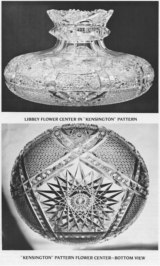 Aztec, Diana, Ellsmere, Empress, Estrella, Kensington, Lorraine, Neola, Prism, Sultana, Senora, Waverly, and Flute and Mitre, with one listed only as No. 25 instead of a name. The prices ranged from a low of $12 to the high of $100 in the largest Flower Center cut in the "Prism" pattern. Libbey Flower Centers are quite rare and seldom surface as an offering by dealers or in an auction sale. As a result of our inquiry, it was learned that the collection of several hundred Libbey items in the Toledo Museum of Art does not include even one example of a Flower Center.