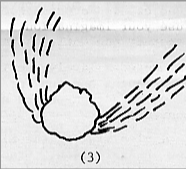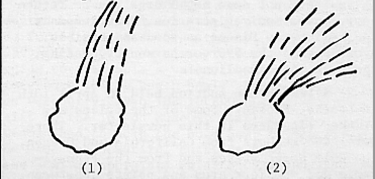 But back to Halley’s Comet of 1910. In early May of that year the comet was as brilliant as the brightest stars. Its great tail stretched about 2/3 of the distance fron the horizon to directly overhead. Even though it was traveling faster than a spaceship, it spent weeks inching its way across the sky because it was no far off. With a bright, roughly round head and a hair-like tail, it looked like a hurling missile with streak marks in its wake. We have several pictures of this 1910 Comet, and it appears to have taken many forms including the following:
