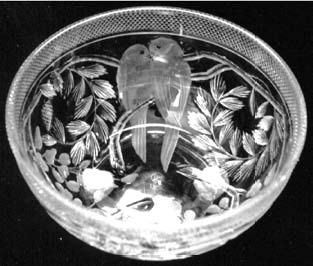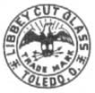 The first glass was made from the new furnaces in August of 1888. The Company changed its name to Libbey Glass Company in1892. The first trademark was the spread wing eagle, usually in red, encircled with the lettering "Libbey Cut Glass Toledo, Ohio." The signature was used during the first years at Toledo (1892 -1896). Signed pieces with this signature are quite scarce. Most of the cut glass produced during this period was the standard strawberry diamond, hobstar, and fan motifs. (Photo 1)