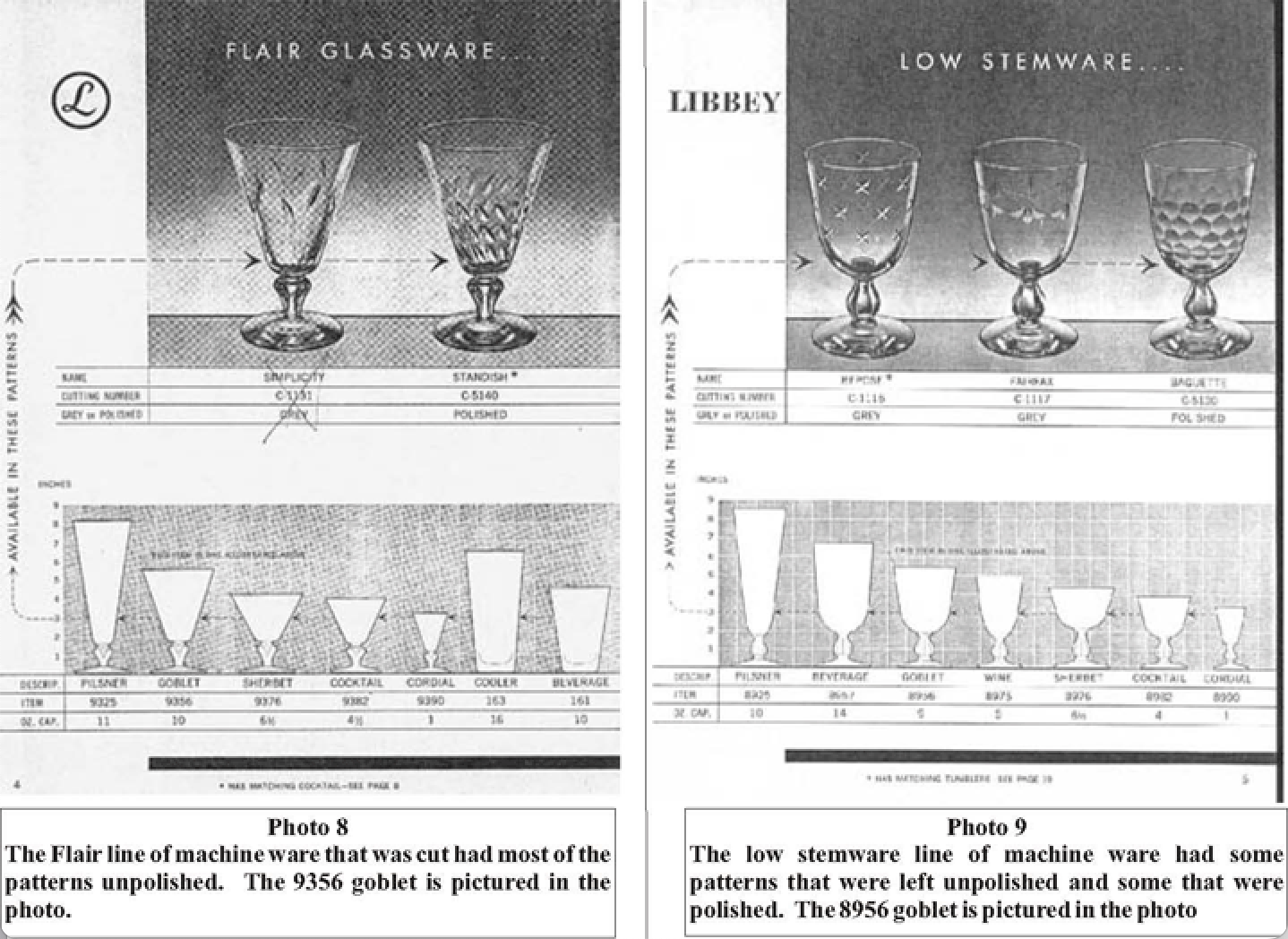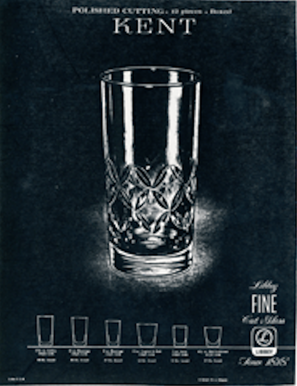This leads to the glassware made in the late 1940’s through the late 1950’s as an era of Libbey collectible glass that up until now has not been touched upon in detail. A catalogue from about 19565 shows Libbey’s lines of glassware like Flair (Photo 8) low stemware (Photo 9), and tumblers that were all machine ware which were cut. An example of tumblers that were cut is the Kent series (Photo 10) as found on the salesman’s sheet. This is a typical example of a machine tumbler made during the fifties. Machine made tumblers usually have a blown-in